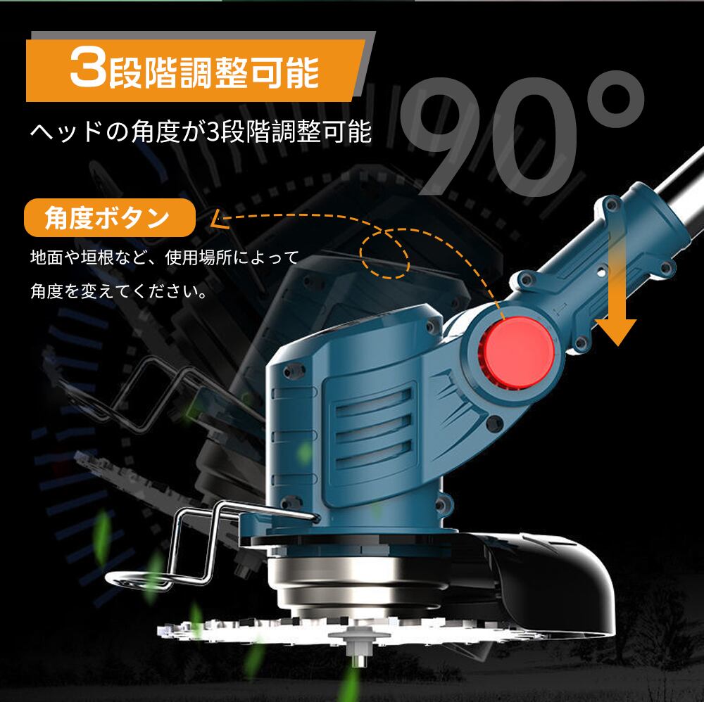【多機能で様々な刈り方が楽しめる!】本商品には、3種類の替刃(樹脂ブレード、金属刃、ナイロンコード)が付属しており、芝刈りだけでなく、枝切りや草刈りにも対応可能です!伸縮式で角度調整も簡単なので、狭い場所や傾斜地でも自由自在に使用できます。コスパ抜群の一台で多機能を実現しましょう!