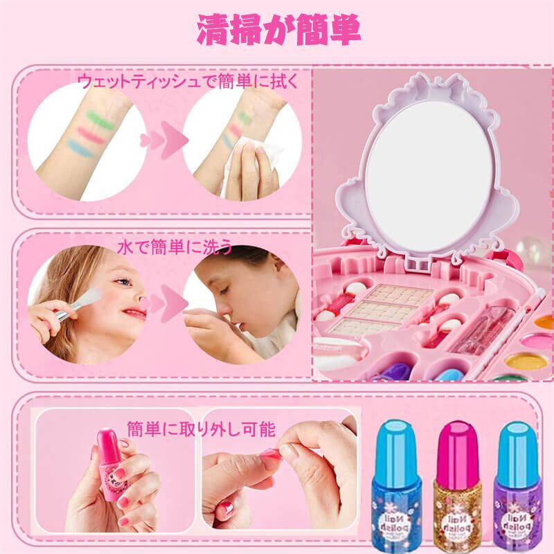 【安全設計で安心して遊べる!】この化粧道具は、全て洗える素材を使用しているため、清潔に保つことができます。子どもが使いやすいサイズで設計されており、遊んだ後のお手入れも簡単です。安心してお子様にお渡しできるアイテムです。この機会に、子どもたちの楽しさと安全を両立させたアイテムを手に入れましょう!